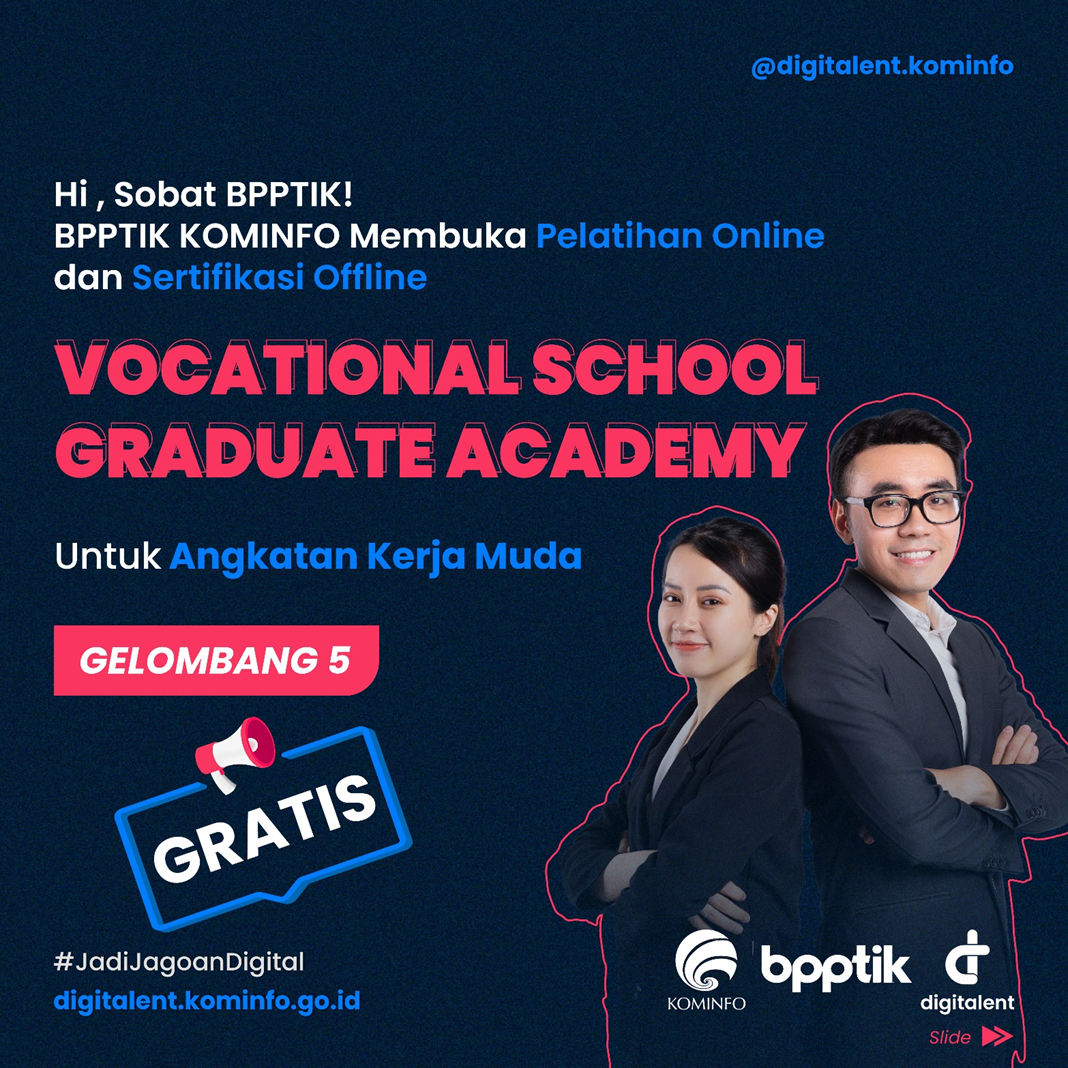 BPPTIK – BPPTIK Kementerian Komunikasi dan Informatika (Kominfo) membuka pendaftaran Pelatihan Digital Talent Scholarship – Vocational School Graduate Academy (VSGA) Gelombang ke-5 Tahun 2023. Pelatihan ini akan diselenggarakan secara daring (online) pada tanggal 22 Mei – 5 Juni 2023 dan dilanjutkan dengan sertifikasi yang akan diselenggarakan secara luring (offline) di Kantor BPPTIK pada tanggal 12 – 21 Juni 2023.