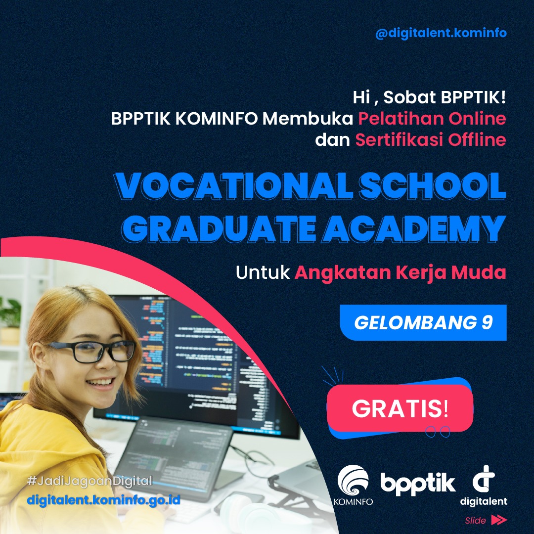 BPPTIK – BPPTIK Kementerian Komunikasi dan Informatika (Kominfo) membuka pendaftaran Pelatihan Digital Talent Scholarship – Vocational School Graduate Academy (VSGA) Gelombang ke-9 Tahun 2023 Khusus untuk angkatan kerja muda yang berdomisili di Kota Bandar Lampung dan sekitarnya. Pelatihan ini akan diselenggarakan secara daring (online) pada tanggal 24 Juli – 3 Agustus 2023 dan dilanjutkan dengan sertifikasi yang akan diselenggarakan secara luring (offline) di kantor BPPTIK pada tanggal 14 – 23 Agustus 2023.