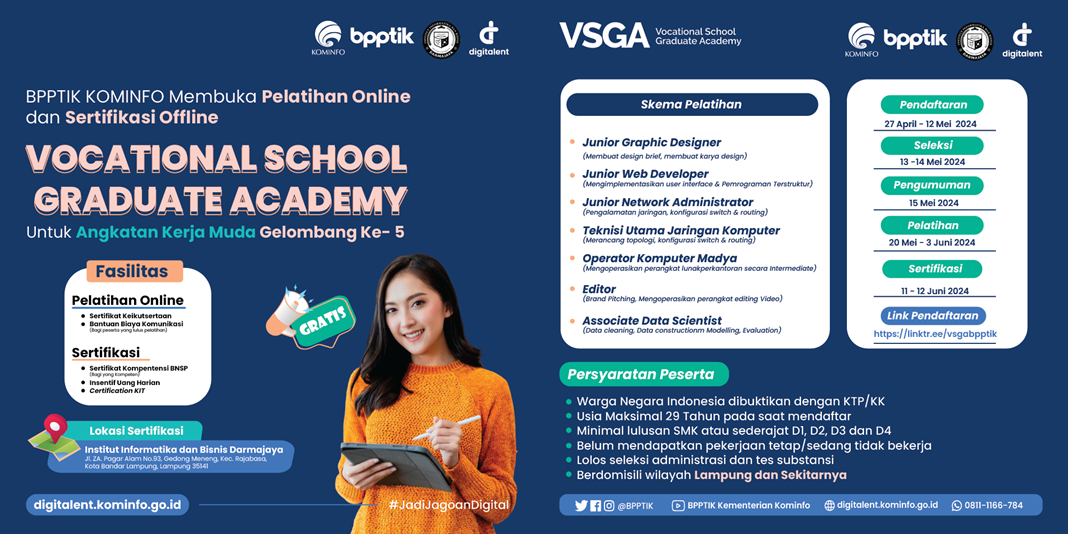 BPPTIK – BPPTIK Kementerian Komunikasi dan Informatika (Kominfo) membuka pendaftaran Digital Talent Scholarship - Vocational School Graduate Academy (VSGA) Gelombang ke-5 Tahun 2024. Kegiatan ini akan diselenggarakan pada tanggal 20 Mei – 3 Juni 2024 secara daring dan dilanjutkan dengan sertifikasi secara luring di Kampus Institut Informatika dan Bisnis Darmajaya Kota Bandarlampung pada tanggal 11 – 12 Juni 2024.