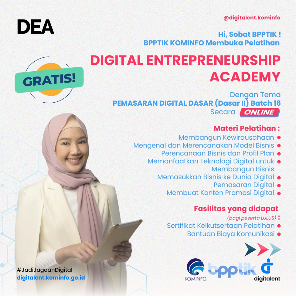 Dibuka, Pendaftaran Pelatihan Digital Entrepreneurship Academy (DEA) Tema Pemasaran Digital Dasar (PDD) Secara Online Batch 16 Tahun 2023