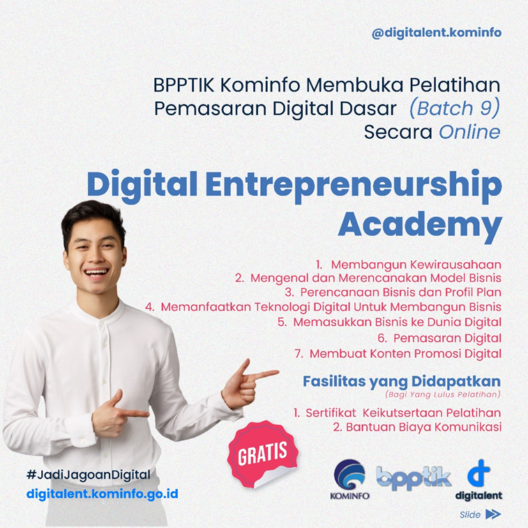 Dibuka, Pendaftaran Pelatihan Digital Entrepreneurship Academy (DEA) Tema Pemasaran Digital Dasar (PDD) Secara Online Batch 9 Tahun 2023