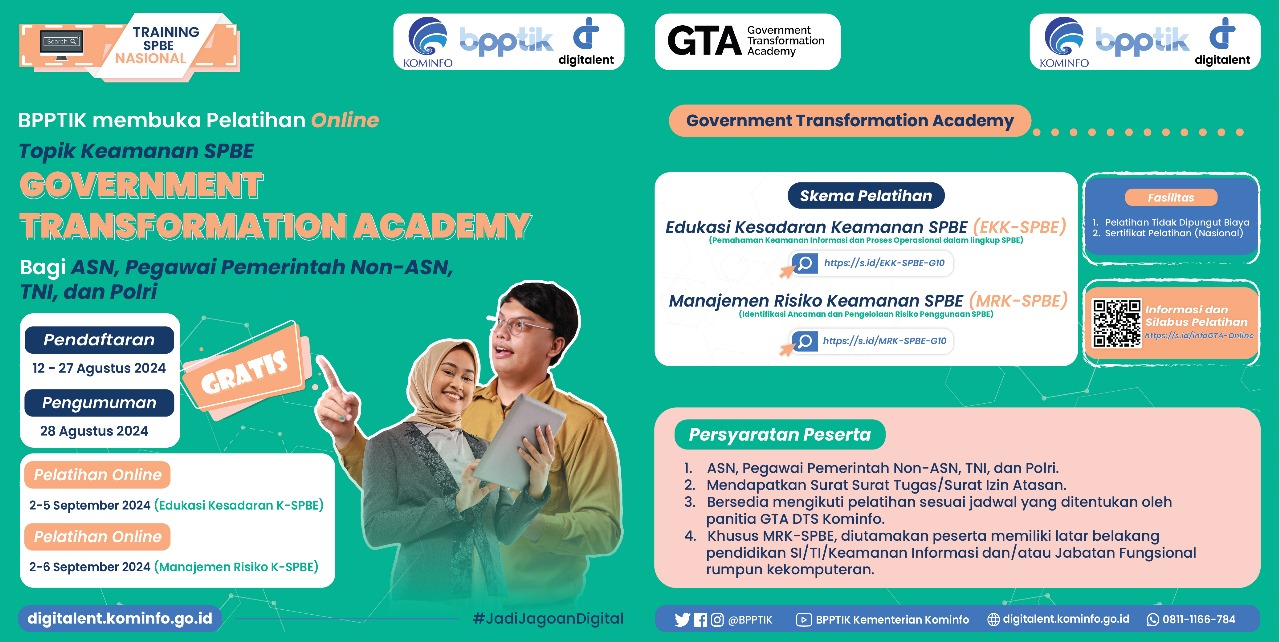 BPPTIK – BPPTIK Kementerian Komunikasi dan Informatika (Kominfo) membuka pendaftaran Digital Talent Scholarship – Government Transformation Academy (GTA) bagiASN, Pegawai Pemerintah Non-ASN, TNI, dan Polri di wilayah Sumatera Selatan Gelombang ke-10 secara Online Tahun 2024. Kegiatan ini akan diselenggarakan pada tanggal 2 – 6 September 2024 secara daring (online).