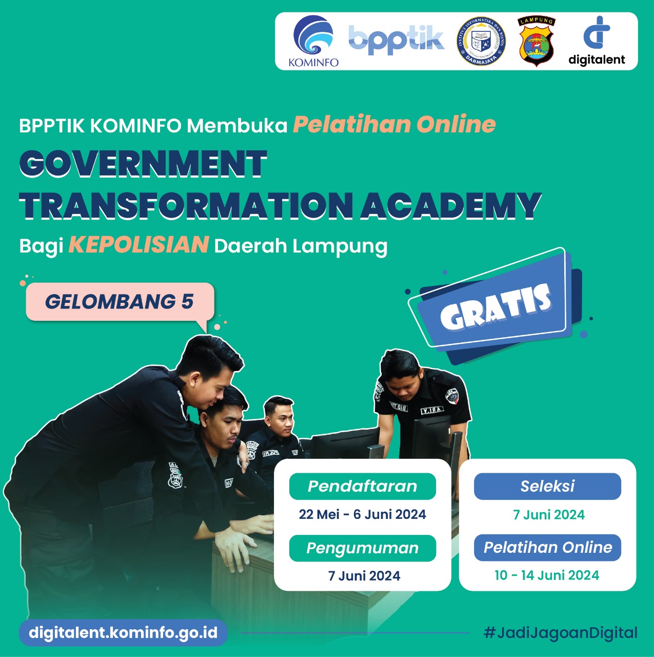 BPPTIK – BPPTIK Kementerian Komunikasi dan Informatika (Kominfo) membuka Pendaftaran Digital Talent Scholarship – Government Transformation Academy (GTA) untuk ASN, TNI, dan POLRI di wilayah Sumatera Selatan, Bengkulu, dan Lampung Gelombang ke-5 secara Online Tahun 2024. Kegiatan ini akan diselenggarakan pada tanggal 10 – 14 Juni 2024 secara daring (online).