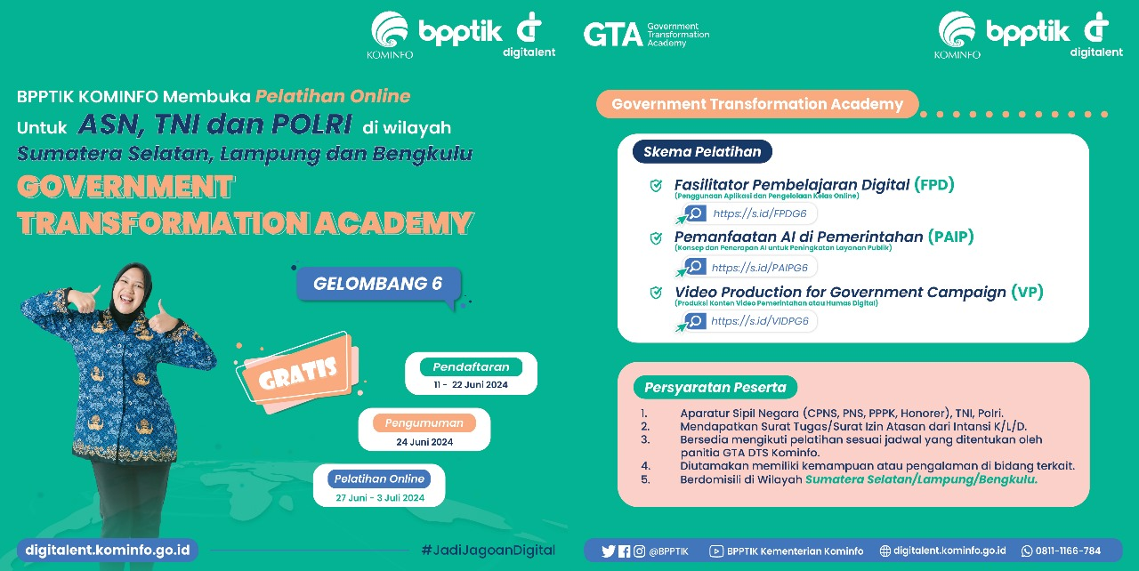 BPPTIK – BPPTIK Kementerian Komunikasi dan Informatika (Kominfo) membuka Pendaftaran Digital Talent Scholarship – Government Transformation Academy (GTA) untuk ASN, TNI, dan POLRI di wilayah Sumatera Selatan, Bengkulu, dan Lampung Gelombang ke-6 secara Online Tahun 2024. Kegiatan ini akan diselenggarakan pada tanggal 27 Juni – 3 Juli 2024 secara daring (online).