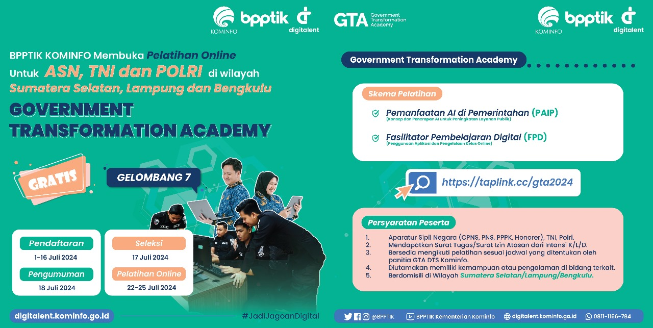 BPPTIK – BPPTIK Kementerian Komunikasi dan Informatika (Kominfo) membuka Pendaftaran Digital Talent Scholarship – Government Transformation Academy (GTA) untuk ASN, TNI, dan POLRI di wilayah Sumatera Selatan, Bengkulu, dan Lampung Gelombang ke-7 secara Online Tahun 2024. Kegiatan ini akan diselenggarakan pada tanggal 22 – 25 Juli 2024 secara daring (online).