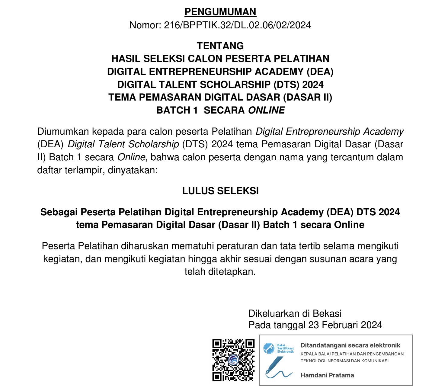 Hasil Seleksi Calon Peserta Pelatihan Digital Enterpreneurship Academy (DEA) Digital Talent Scholarship (DTS) 2024 Tema Pemasaran Digital Dasar (Dasar II) Batch 1 Secara Online