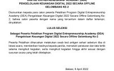 Diumumkan kepada para calon peserta Pelatihan Program Digital Entrepreneurship Academy (DEA) Digital Talent Scholarship 2022 Secara Offline Gelombang Ke-2 bagi Pelaku Usaha Kota Depok, bahwa calon peserta dengan nama yang tercantum dalam daftar terlampir, dinyatakan: