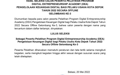 HASIL SELEKSI CALON PESERTA PELATIHAN PROGRAM DIGITAL ENTREPRENEURSHIP ACADEMY (DEA) DIGITAL TALENT SCHOLARSHIP 2022 SECARA OFFLINE GELOMBANG KE-3 BAGI PELAKU USAHA KOTA DEPOK
