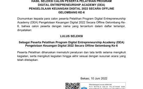 Diumumkan kepada para calon peserta Pelatihan Program Digital Entrepreneurship Academy (DEA) Digital Talent Scholarship 2022 Secara Offline Gelombang Ke-6, bahwa calon peserta dengan nama yang tercantum dalam daftar terlampir, dinyatakan: