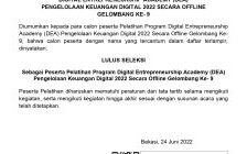 Diumumkan kepada para calon peserta Pelatihan Program Vocational School Graduate Academy (VSGA) Digital Talent Scholarship 2022 Gelombang ke-4 Secara Online, bahwa calon peserta dengan nama yang tercantum dalam daftar terlampir, dinyatakan:
