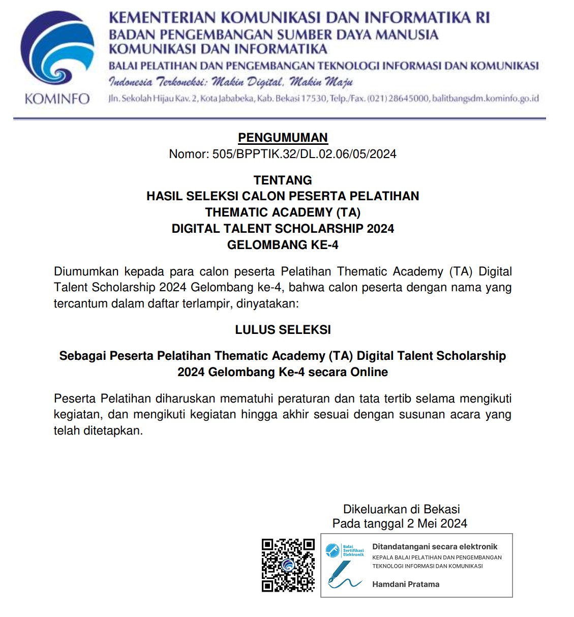 Diumumkan kepada para calon peserta Pelatihan Thematic Academy (TA) Digital Talent Scholarship 2024 Gelombang ke-4, bahwa calon peserta dengan nama yang tercantum dalam daftar terlampir, dinyatakan: