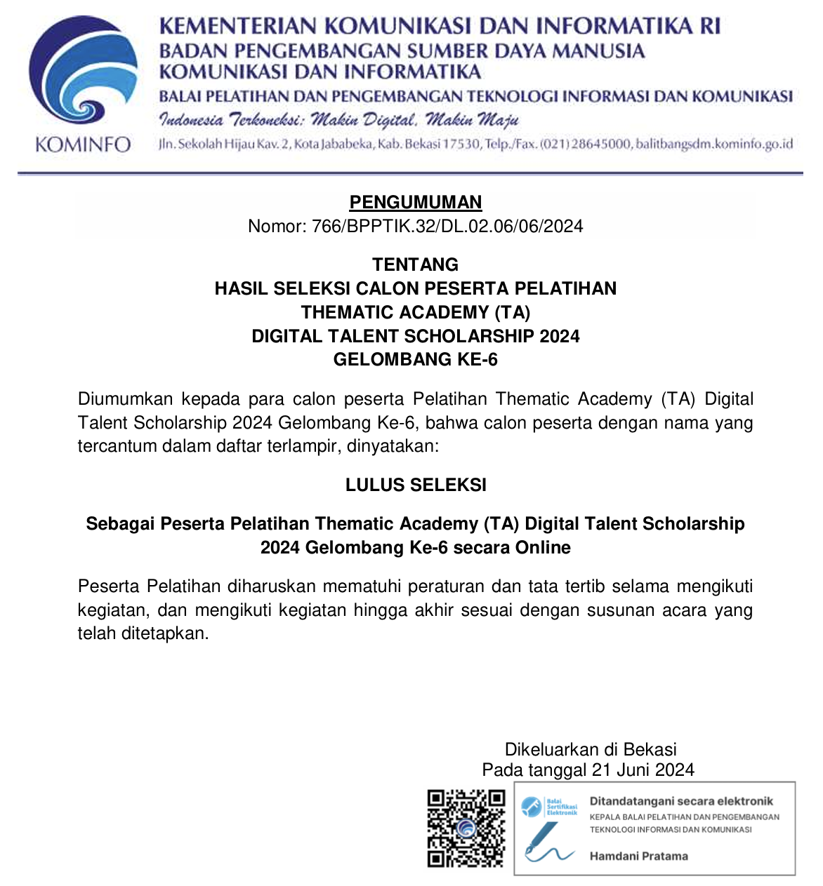 Diumumkan kepada para calon peserta Pelatihan Thematic Academy (TA) Digital Talent Scholarship 2024 Gelombang ke-6 bahwa calon peserta dengan nama yang tercantum dalam daftar terlampir, dinyatakan: