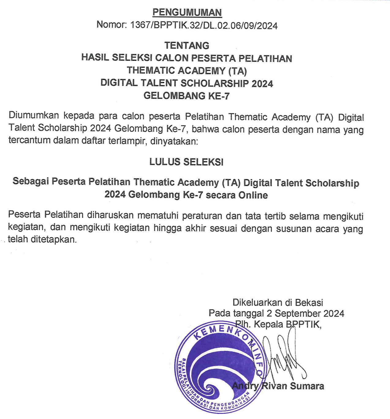 Pengumuman Hasil Seleksi Calon Peserta Pelatihan Thematic Academy (TA) Digital Talent Scholarship 2024 Gelombang Ke-7