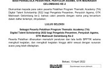 HASIL SELEKSI CALON PESERTA THEMATIC ACADEMY (TA) PELATIHAN BIDANG TIK BAGI PENGELOLA PESANTREN, PENYULUH AGAMA, GTK MADRASAH 2022 GELOMBANG KE-2 SECARA ONLINE