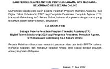 Diumumkan kepada para calon peserta Program Thematic Academy (TA) Digital Talent Scholarship Pelatihan Bidang TIK Bagi Pengelola Pesantren, Penyuluh Agama, GTK Madrasah 2022 Gelombang Ke-3 Secara Online, bahwa calon peserta dengan nama yang tercantum dalam daftar terlampir, dinyatakan: