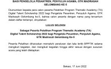 HASIL SELEKSI CALON PESERTA THEMATIC ACADEMY (TA) PELATIHAN BIDANG TIK BAGI PENGELOLA PESANTREN, PENYULUH AGAMA, GTK MADRASAH 2022 GELOMBANG KE-5 SECARA ONLINE