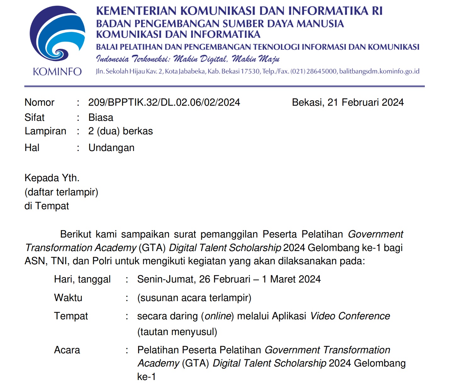 Pemanggilan Peserta Pelatihan Government Transformation Academy (GTA) Digital Talent Scholarship 2024 Gelombang ke-1