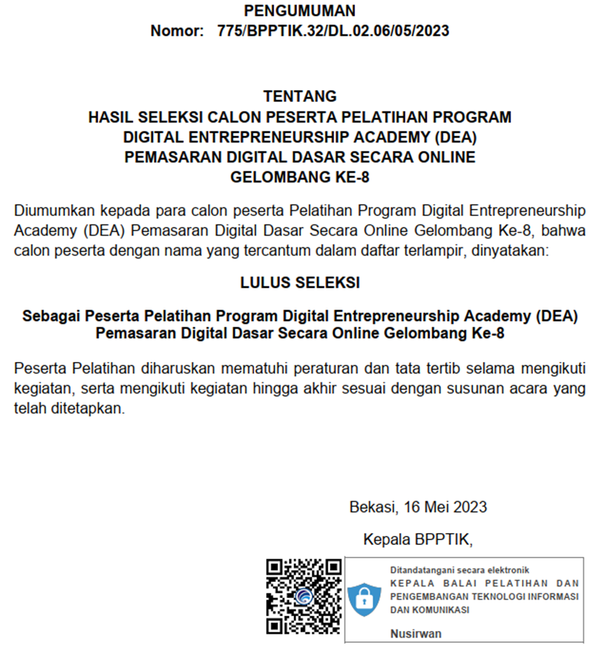 Pengumuman Hasil Seleksi Calon Peserta Pelatihan Program DEA DTS 2023 Tema Pemasaran Digital Dasar Batch 8