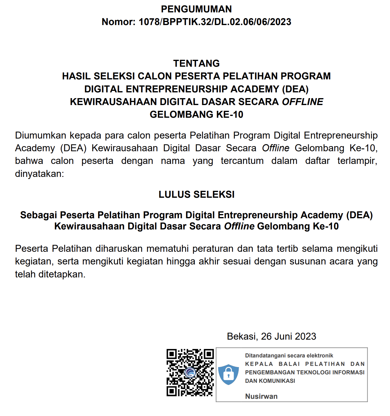 Diumumkan kepada para calon peserta Pelatihan Program Digital Entrepreneurship Academy (DEA) Kewirausahaan Digital Dasar (KDD) Secara Offline Batch 10 bahwa calon peserta dengan nama yang tercantum dalam daftar terlampir, dinyatakan LULUS SELEKSI Sebagai Peserta Pelatihan Program Digital Entrepreneurship Academy (DEA) Kewirausahaan Digital Dasar Secara Offline Batch 10.