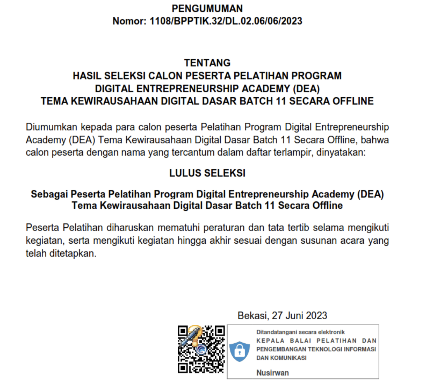 Diumumkan kepada para calon peserta Pelatihan Program Digital Entrepreneurship Academy (DEA) Kewirausahaan Digital Dasar (KDD) Secara Offline Batch 11 bahwa calon peserta dengan nama yang tercantum dalam daftar terlampir, dinyatakan LULUS SELEKSI Sebagai Peserta Pelatihan Program Digital Entrepreneurship Academy (DEA) Kewirausahaan Digital Dasar Secara Offline Batch 11.