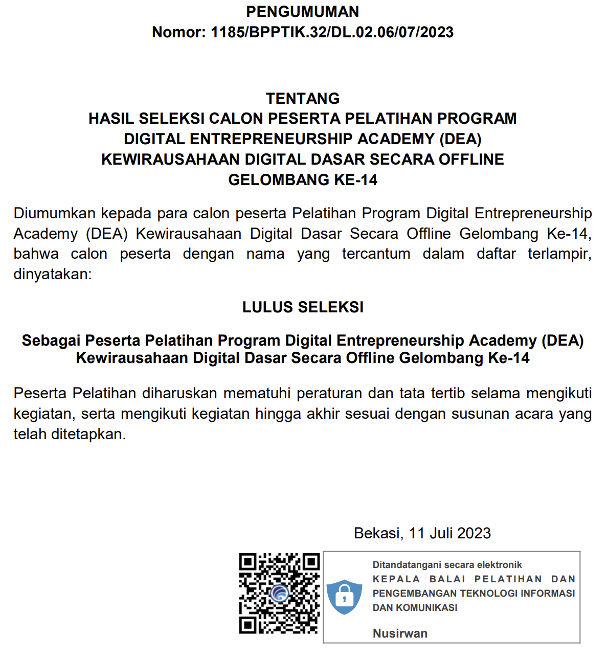 Pengumuman Hasil Seleksi Calon Peserta Pelatihan Program Digital Entrepreneurship Academy (DEA) Kewirausahaan Digital Dasar Secara Offline Batch 14