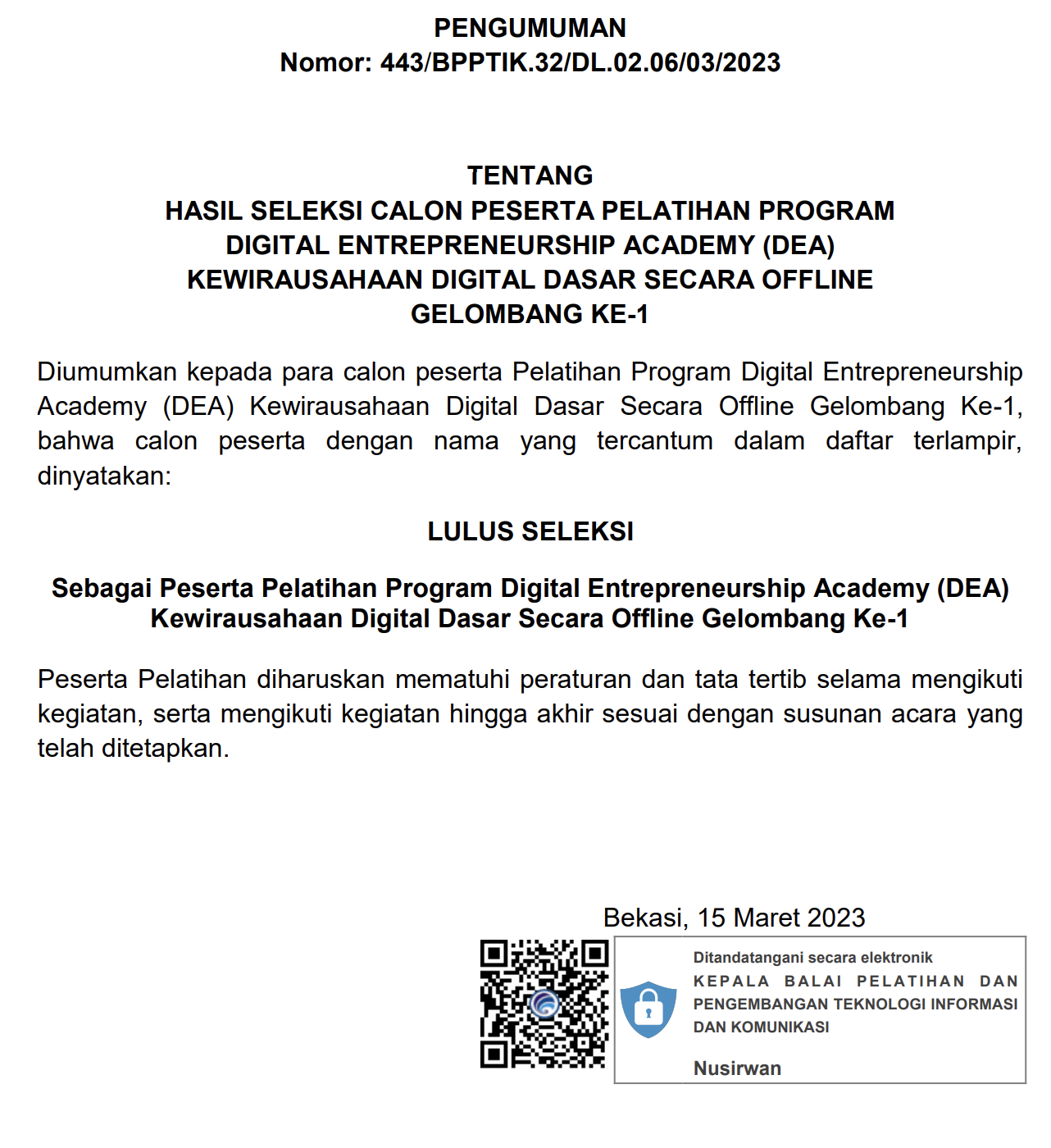 Pengumuman Hasil Seleksi Calon Peserta Pelatihan Program Digital Entrepreneurship Academy (DEA) Kewirausahaan Digital Dasar Secara Offline Gelombang Ke-1