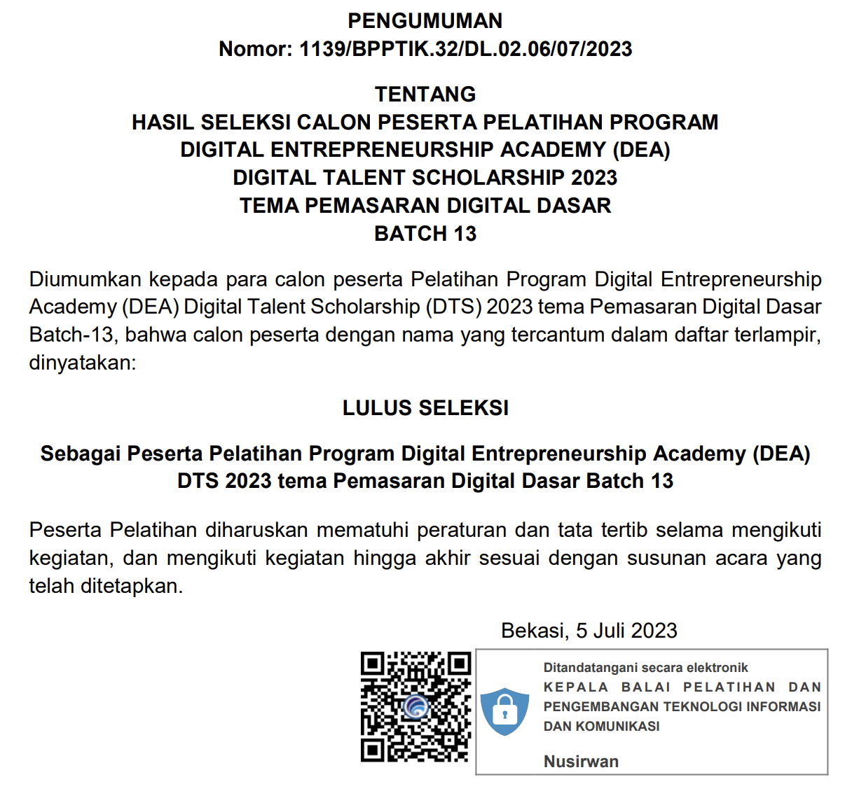 Diumumkan kepada para calon peserta Pelatihan Program Digital Entrepreneurship Academy (DEA) Pemasaran Digital Dasar (PDD) Secara Online Batch 13 bahwa calon peserta dengan nama yang tercantum dalam daftar terlampir, dinyatakan LULUS SELEKSI Sebagai Peserta Pelatihan Program Digital Entrepreneurship Academy (DEA) Pemasaran Digital Dasar Secara Online Batch 13.