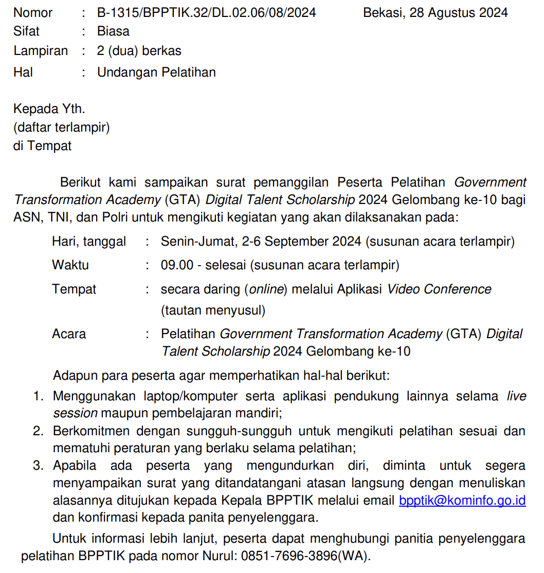 Pengumuman Hasil Seleksi Calon Peserta Pelatihan Program GTA DTS 2024 Gelombang Ke-10