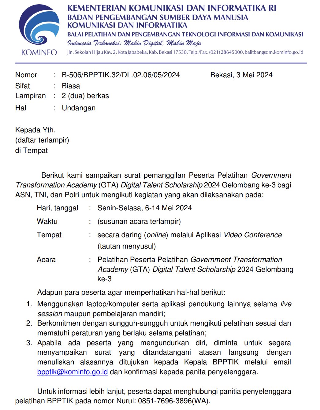Pengumuman Hasil Seleksi Calon Peserta Pelatihan Program GTA DTS 2024 Gelombang Ke-3