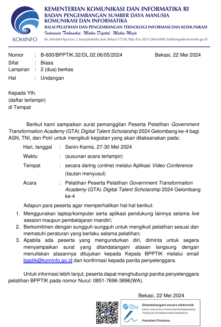 Diumumkan kepada para calon peserta pelatihan Program Government Transformation Academy (GTA) Digital Talent Scholarship 2024 Gelombang ke-4 bahwa calon peserta dengan nama yang tercantum dalam daftar terlampir dinyatakan LULUS SELEKSI sebagai peserta pelatihan Program Government Transformation Academy (GTA) Digital Talent Scholarship 2024 Gelombang Ke-4.