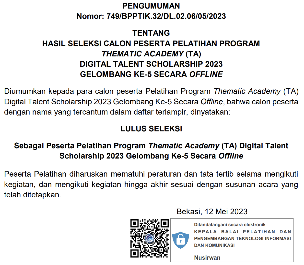 Diumumkan kepada para calon peserta Pelatihan Program Thematic Academy (TA) Digital Talent Scholarship 2023 Gelombang Ke-5 bahwa calon peserta dengan nama yang tercantum dalam daftar terlampir dinyatakan LULUS SELEKSI sebagai peserta Pelatihan Program Thematic Academy (TA) Digital Talent Scholarship 2023 Gelombang Ke-5.