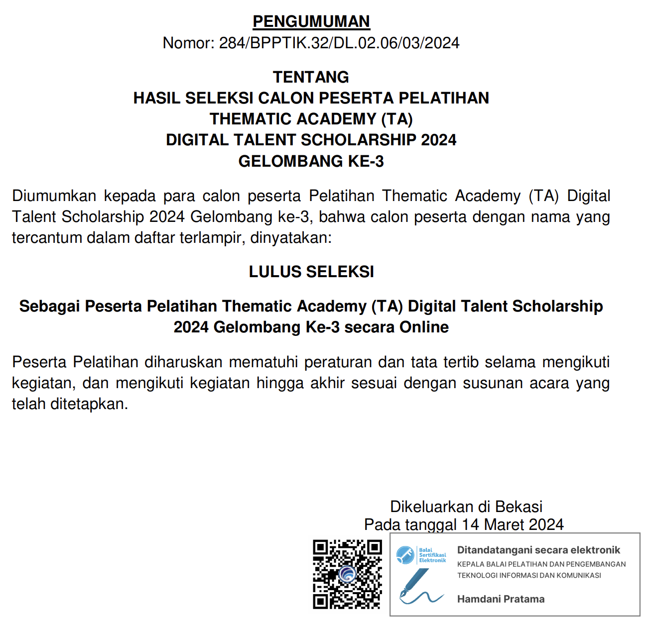 Diumumkan kepada para calon peserta pelatihan Program Thematic Academy (TA) Digital Talent Scholarship 2024 Gelombang ke-3 bahwa calon peserta dengan nama yang tercantum dalam daftar terlampir dinyatakan LULUS SELEKSI sebagai peserta pelatihan Program Thematic Academy (TA) Digital Talent Scholarship 2024 Gelombang Ke-3.