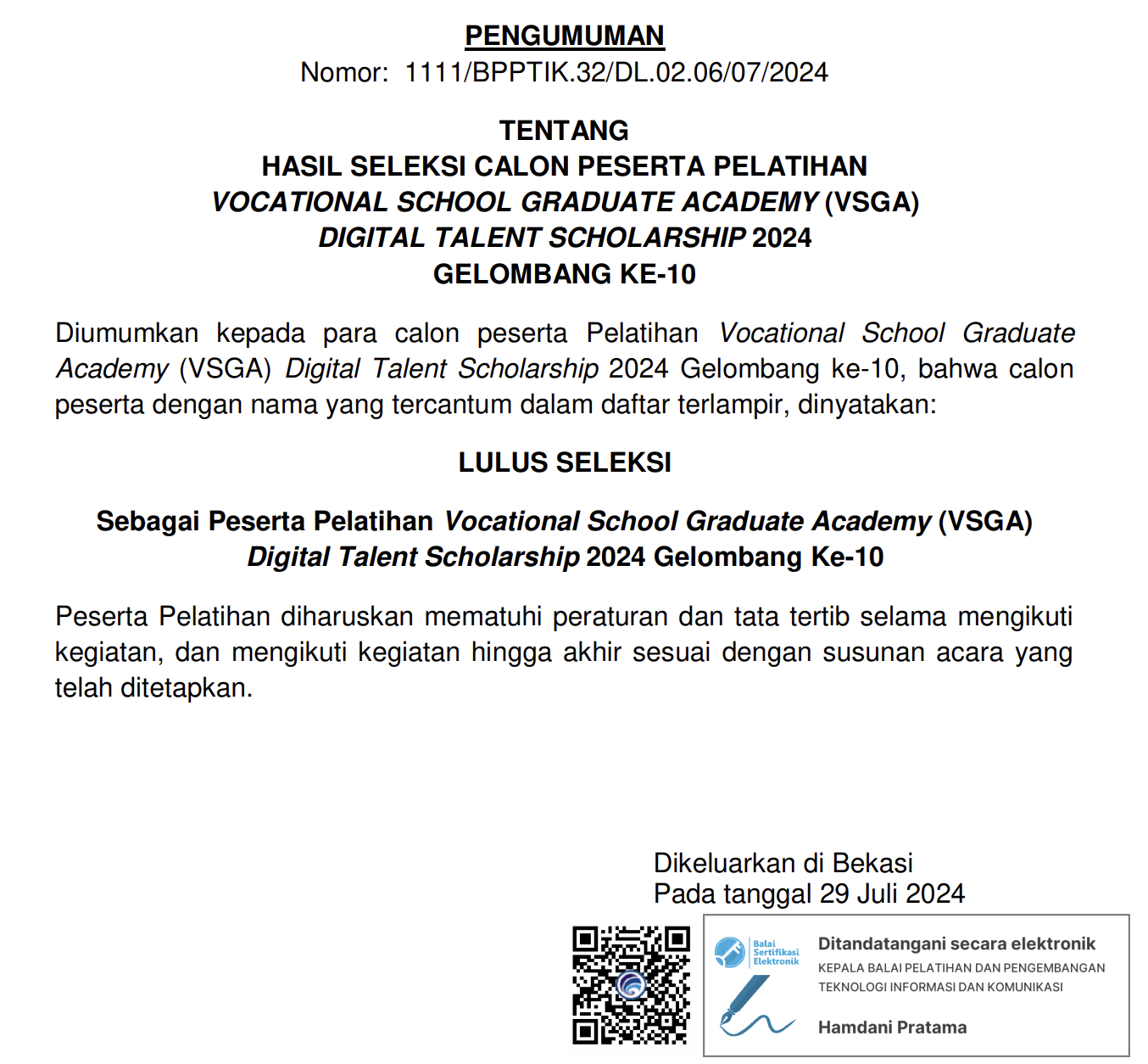 Pengumuman Hasil Seleksi Calon Peserta Pelatihan Program VSGA DTS 2024 Gelombang Ke-10
