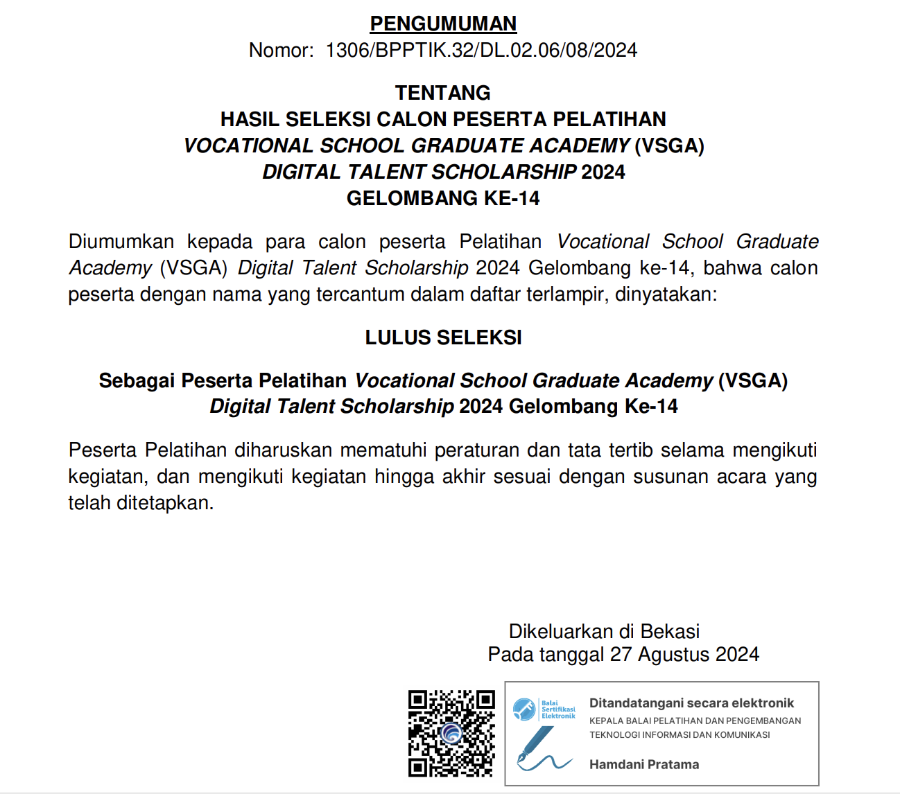 Diumumkan kepada para calon peserta pelatihan Program Vocational School Graduate Academy (VSGA) Digital Talent Scholarship 2024 Gelombang ke-14 Universitas Bengkulu bahwa calon peserta dengan nama yang tercantum dalam daftar terlampir dinyatakan LULUS SELEKSI sebagai peserta pelatihan Program Vocational School Graduate Academy (VSGA) Digital Talent Scholarship 2024 Gelombang Ke-14 Universitas Bengkulu.