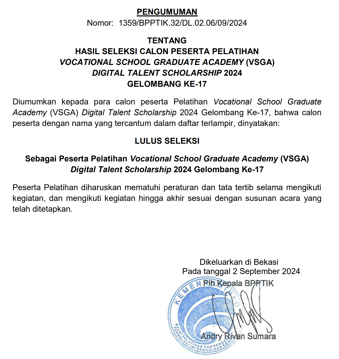 Pengumuman Hasil Seleksi Calon Peserta Pelatihan Program VSGA DTS 2024 Gelombang Ke-17 Universitas Dehasen