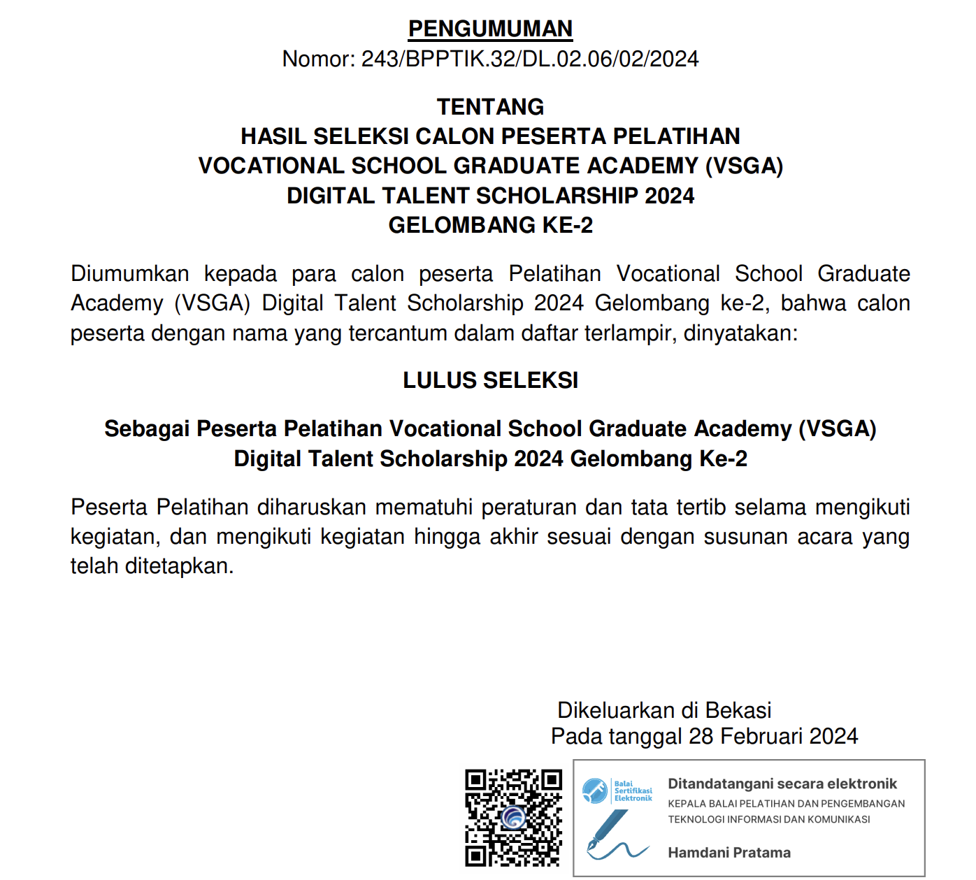 Pengumuman Hasil Seleksi Calon Peserta Pelatihan Program VSGA DTS 2024 Gelombang Ke-2