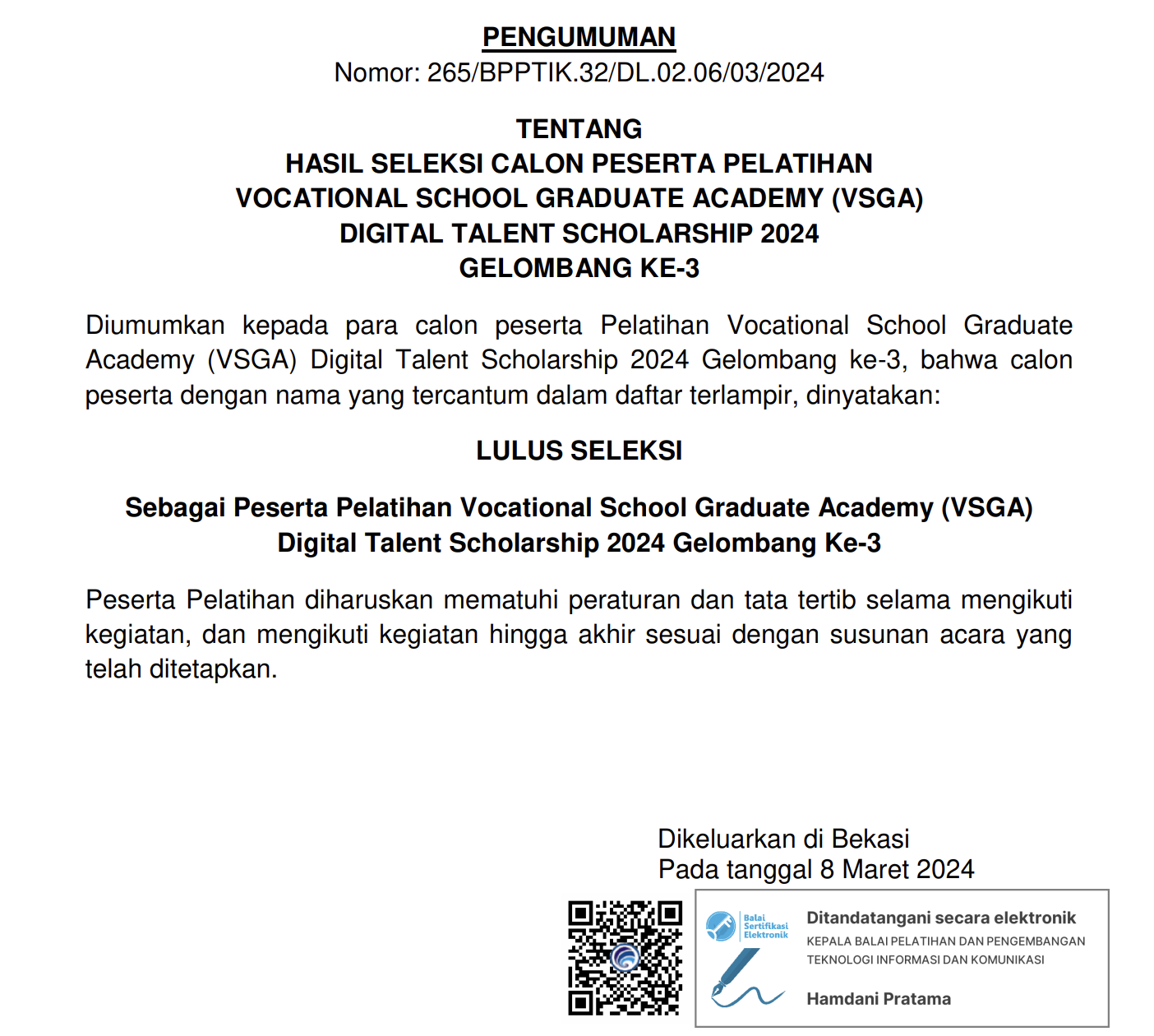 Pengumuman Hasil Seleksi Calon Peserta Pelatihan Program VSGA DTS 2024 Gelombang Ke-3