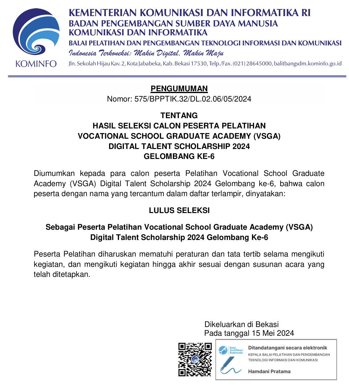 Pengumuman Hasil Seleksi Calon Peserta Pelatihan Program VSGA DTS 2024 Gelombang Ke-6