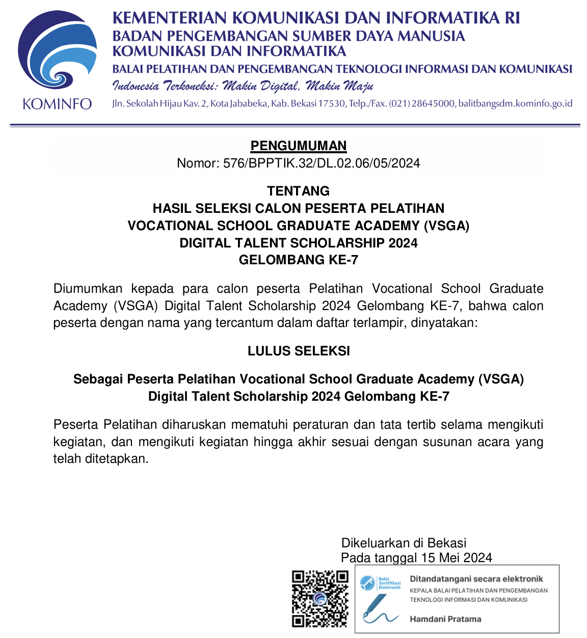 Pengumuman Hasil Seleksi Calon Peserta Pelatihan Program VSGA DTS 2024 Gelombang Ke-7