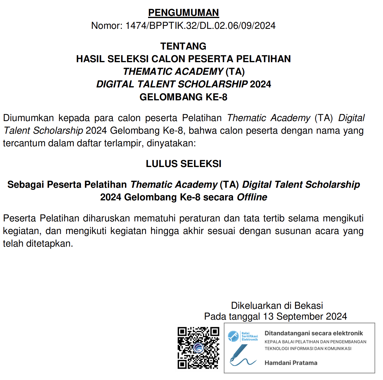 Pengumuman Hasil Seleksi Calon Peserta Pelatihan Thematic Academy (TA) Digital Talent Scholarship 2024 Gelombang Ke-8