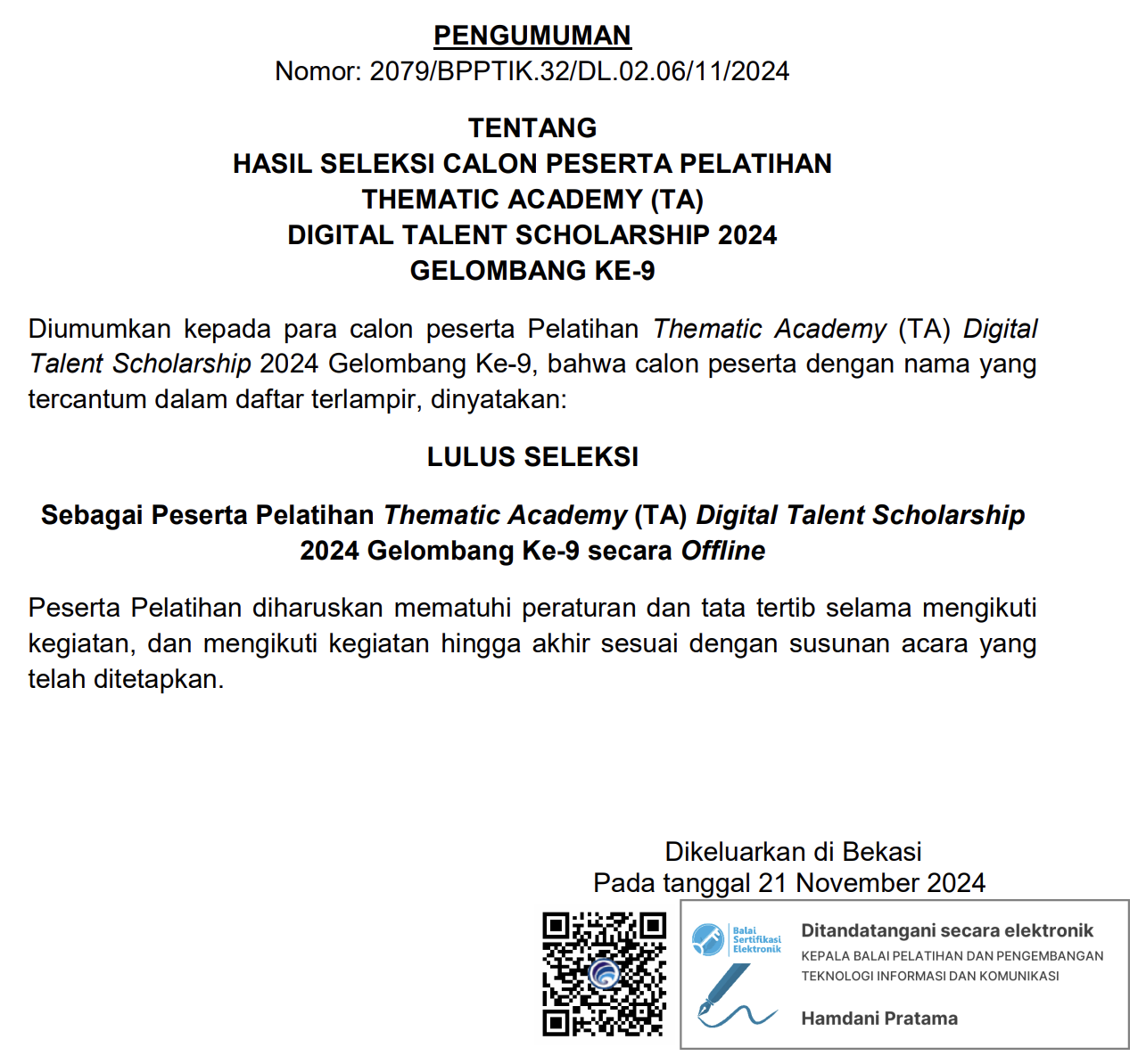 Pengumuman Hasil Seleksi Calon Peserta Pelatihan Thematic Academy (TA) Digital Talent Scholarship 2024 Gelombang Ke-9 Offline