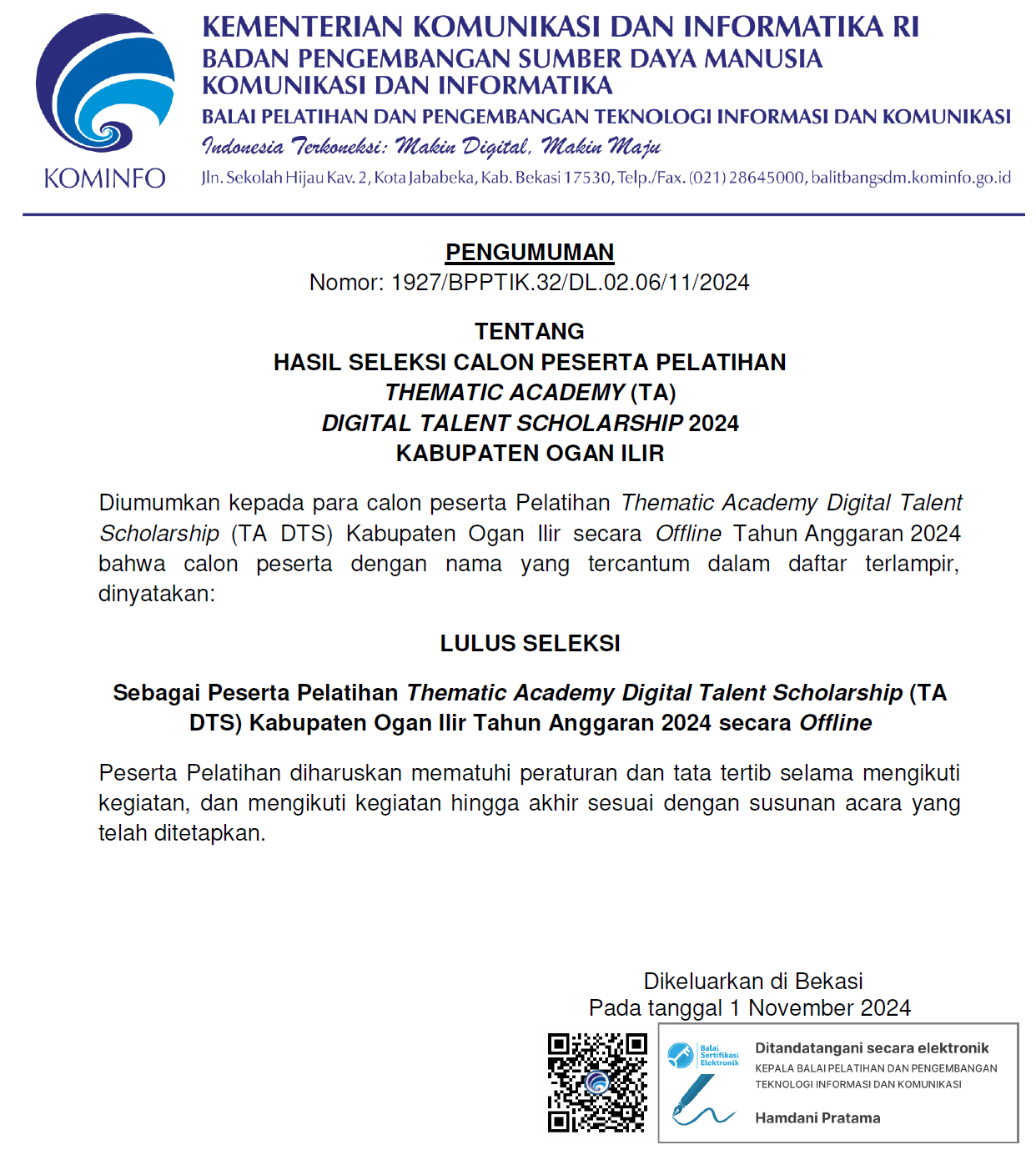 Pengumuman Hasil Seleksi Calon Peserta Pelatihan Thematic Academy (TA) Digital Talent Scholarship 2024 Kabupaten Ogan Ilir
