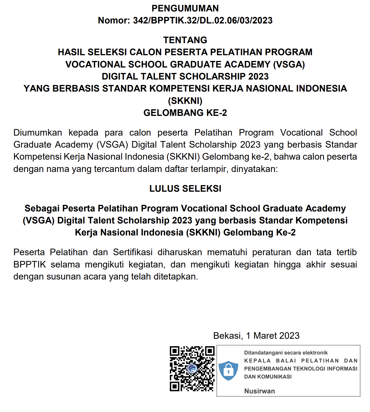 Diumumkan kepada para calon peserta Pelatihan Program Vocational School Graduate Academy (VSGA) Digital Talent Scholarship 2023 yang berbasis Standar Kompetensi Kerja Nasional Indonesia (SKKNI) Gelombang ke-2 bahwa calon peserta dengan nama yang tercantum dalam daftar terlampir dinyatakan LULUS SELEKSI Sebagai peserta Pelatihan Program Vocational School Graduate Academy (VSGA) Digital Talent Scholarship 2023 yang berbasis Standar Kompetensi Kerja Nasional Indonesia (SKKNI) Gelombang Ke-2.