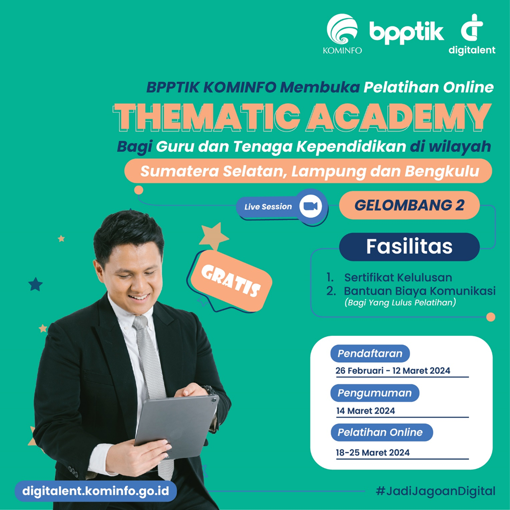 BPPTIK – BPPTIK Kementerian Komunikasi dan Informatika (Kominfo) membuka Pendaftaran Digital Talent Scholarship Thematic Academy (TA) bagi Guru dan Tenaga Kependidikan Gelombang ke-2 Tahun 2024. Kegiatan ini akan diselenggarakan pada tanggal 18 –25 Maret secara daring (online) melalui aplikasi online meeting.