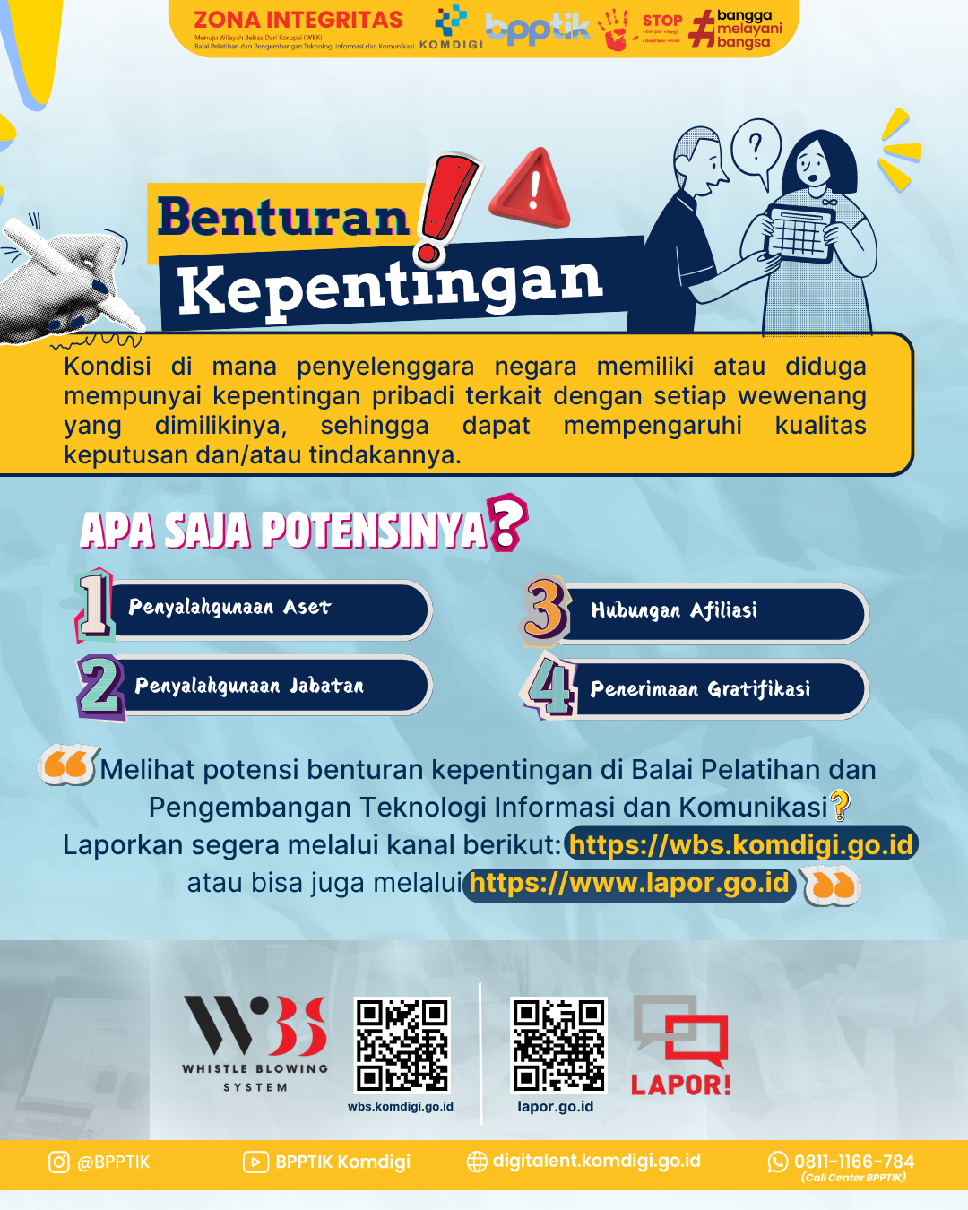 Sebagai bagian dari komitmen membangun Zona Integritas menuju Wilayah Bebas dari Korupsi (WBK), BPPTIK mengajak seluruh pegawai dan pemangku kepentingan untuk mewaspadai dan mencegah segala bentuk benturan kepentingan.